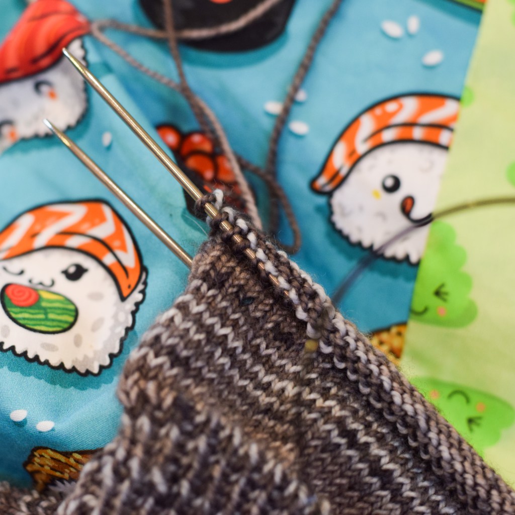 Notes: 72 stitch cast on, will likely do afterthought heel in the brown coordinating mini skein and the toes in the powder blue coordinating mini skein.