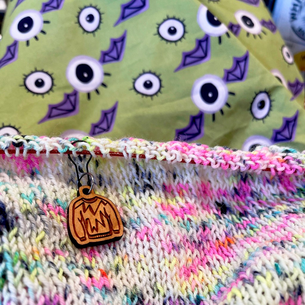 More progress on the body of the Boxy Chevrons by Susanne Somer in Lemonade Shop Yarns House Sock in “Ice Cream Truck” & “Gasoline”. Oink Pigments Mystic in “Nothing Rhymes with Orange” is the Accent Pop at the end of each sleeve.