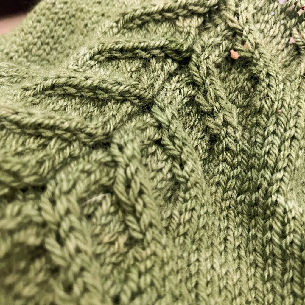 Sleeves are done for the Hearthstone Pullover. Raglan decreases are done but I forgot to continue the cable on the outside of the center, so I need to frog back.
